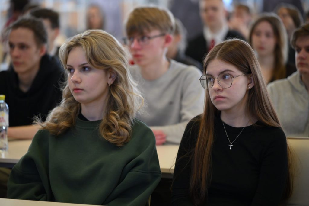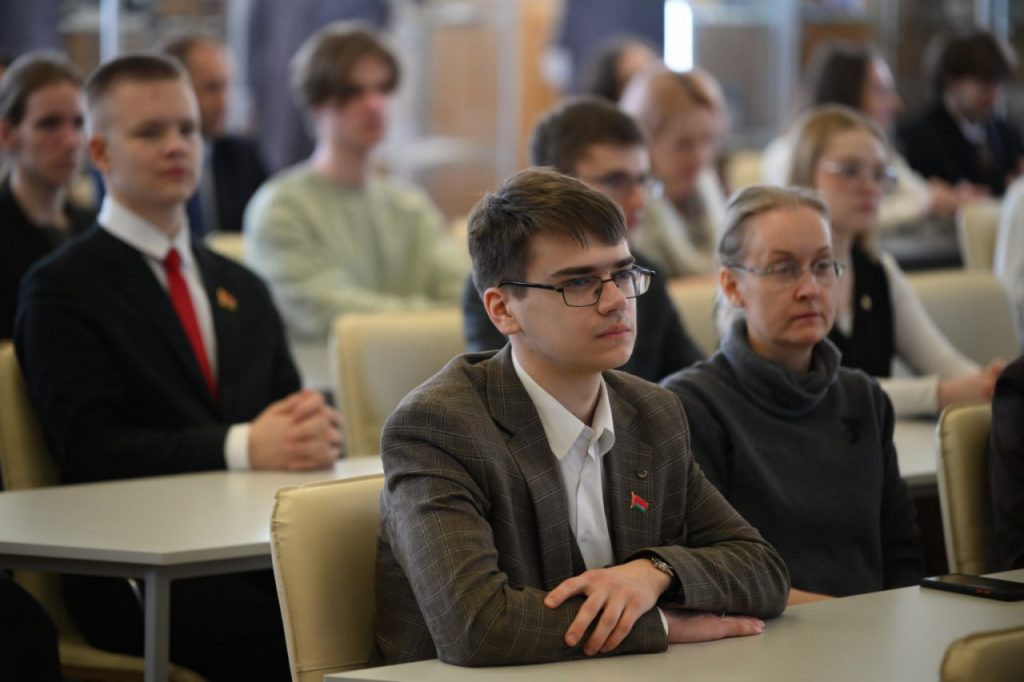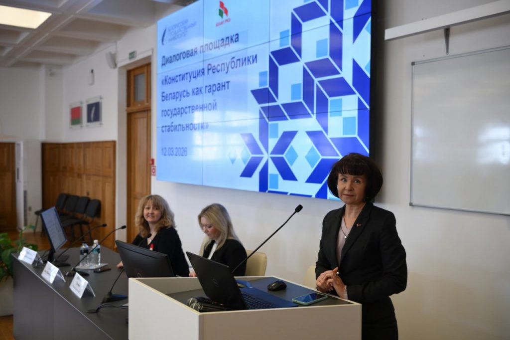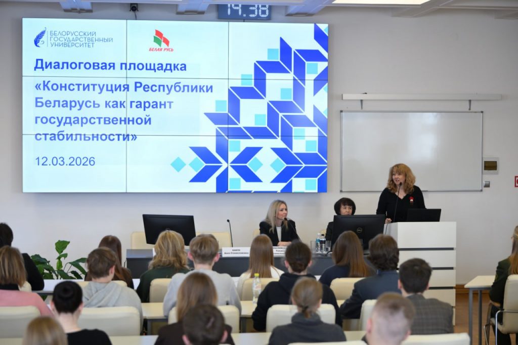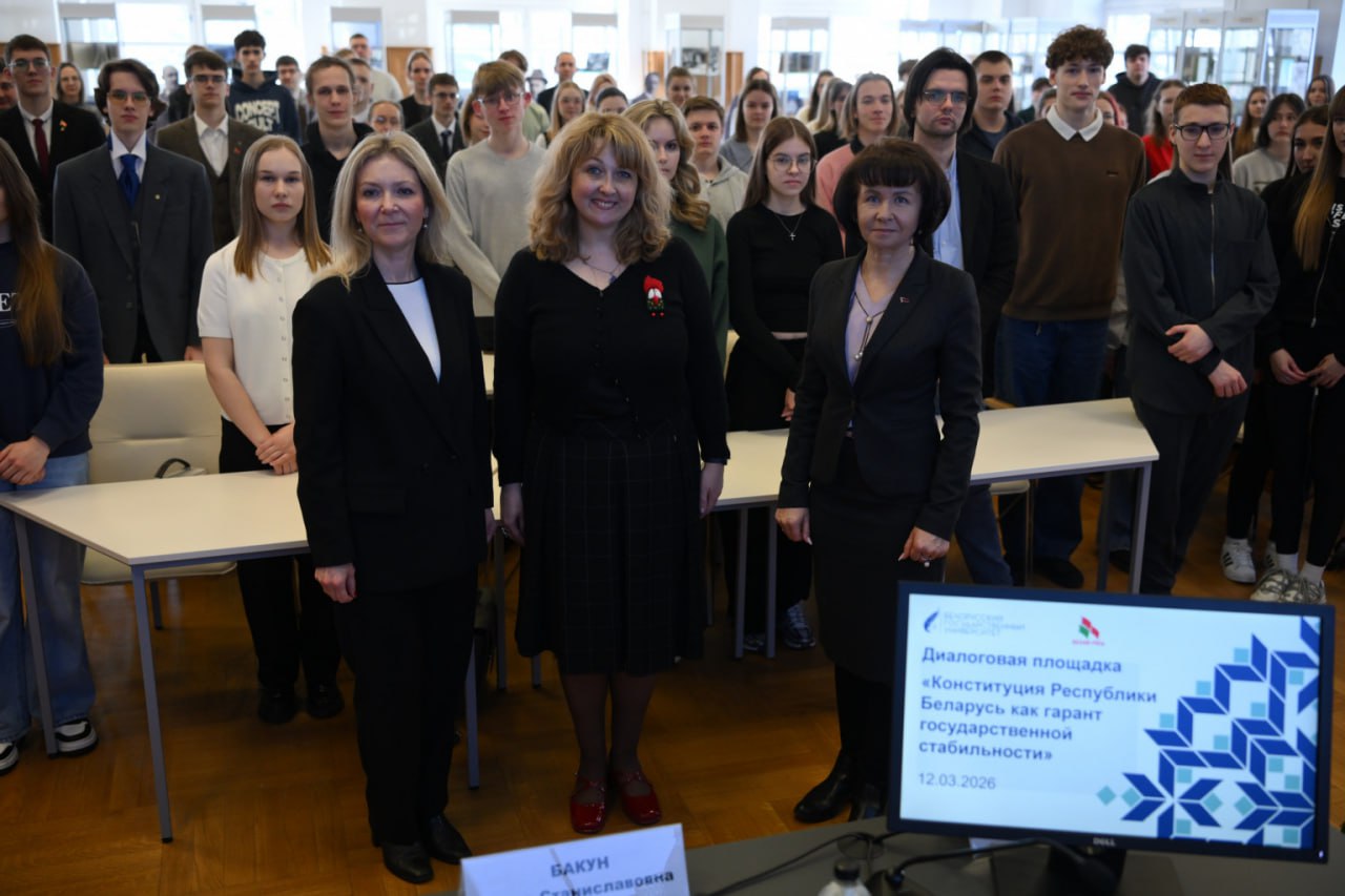 12.03.2026 на факультете географии и геоинформатики состоялась общеуниверситетская диалоговая площадка «Конституция Республики Беларусь как гарант государственной стабильности» с участием проректора по идеологической и воспитательной работе Анны Бакун, председателя «Белой Руси» Марины Гутовской, доцента кафедры конституционного права Татьяны Масловской, студентов и руководства всех факультетов вуза.
